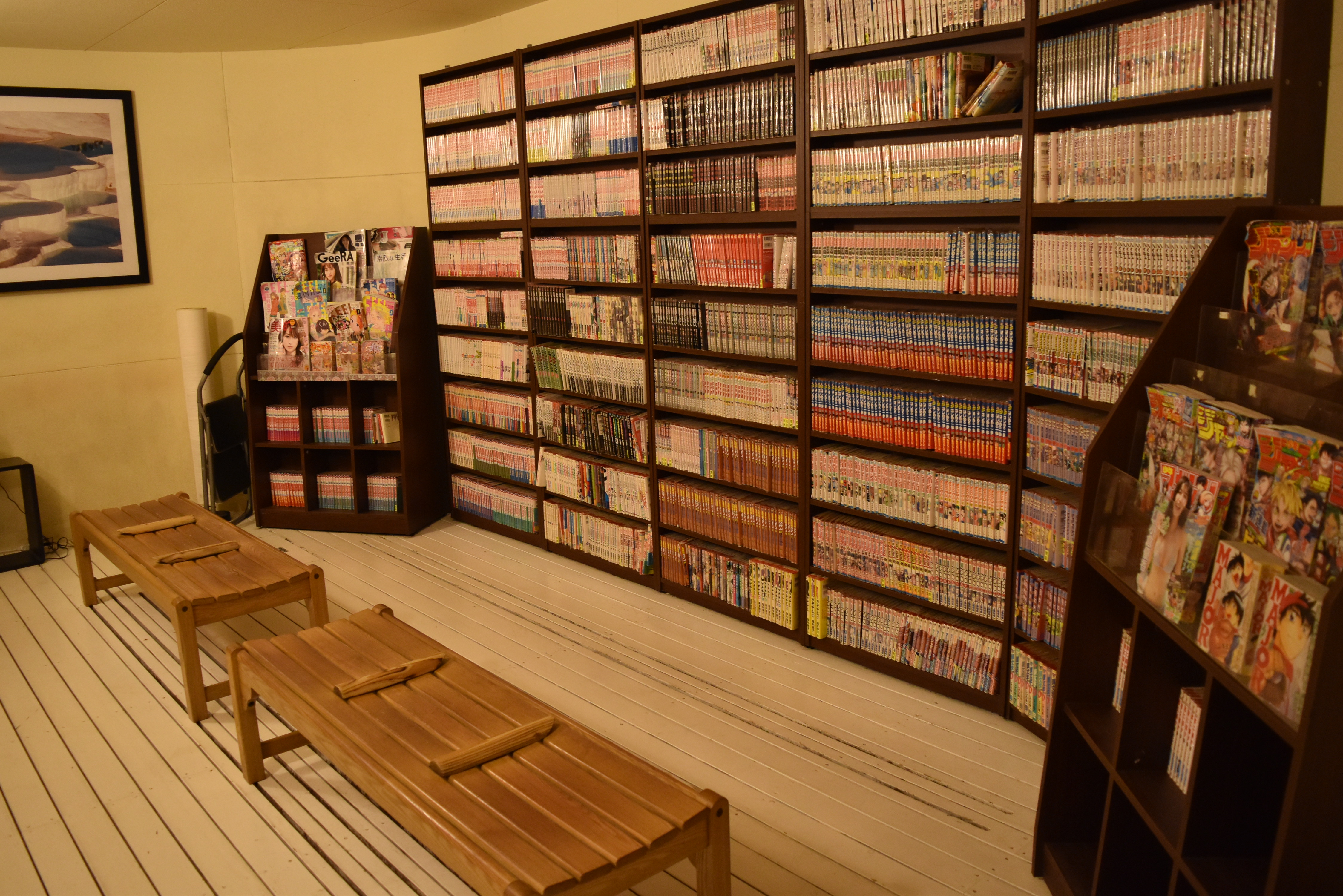 内設のクールルームには約2,500冊、リラックスラウンジに約3,000冊の漫画を設置。