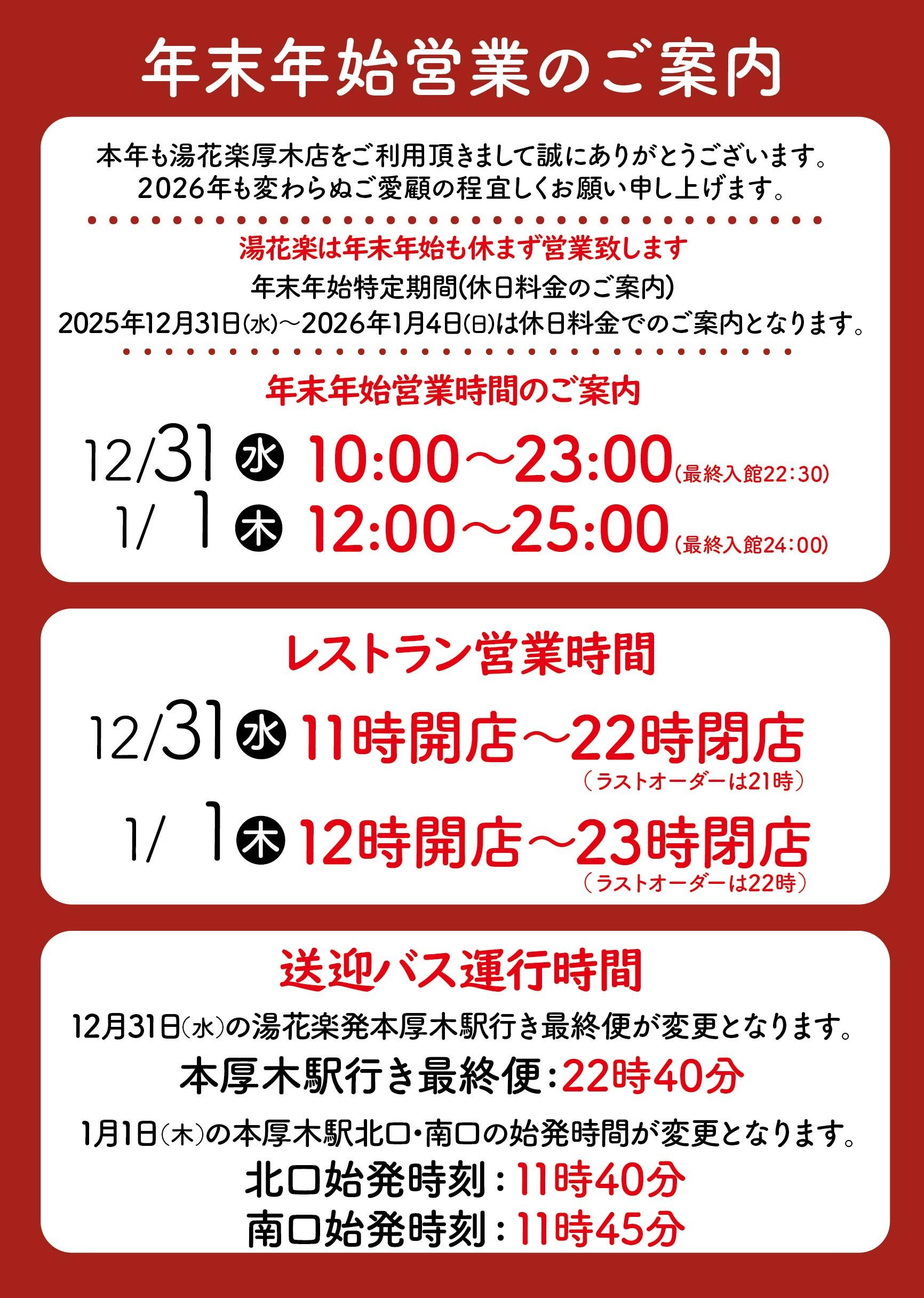 大晦日及び元旦の2日間は営業時間に変更が御座いますので